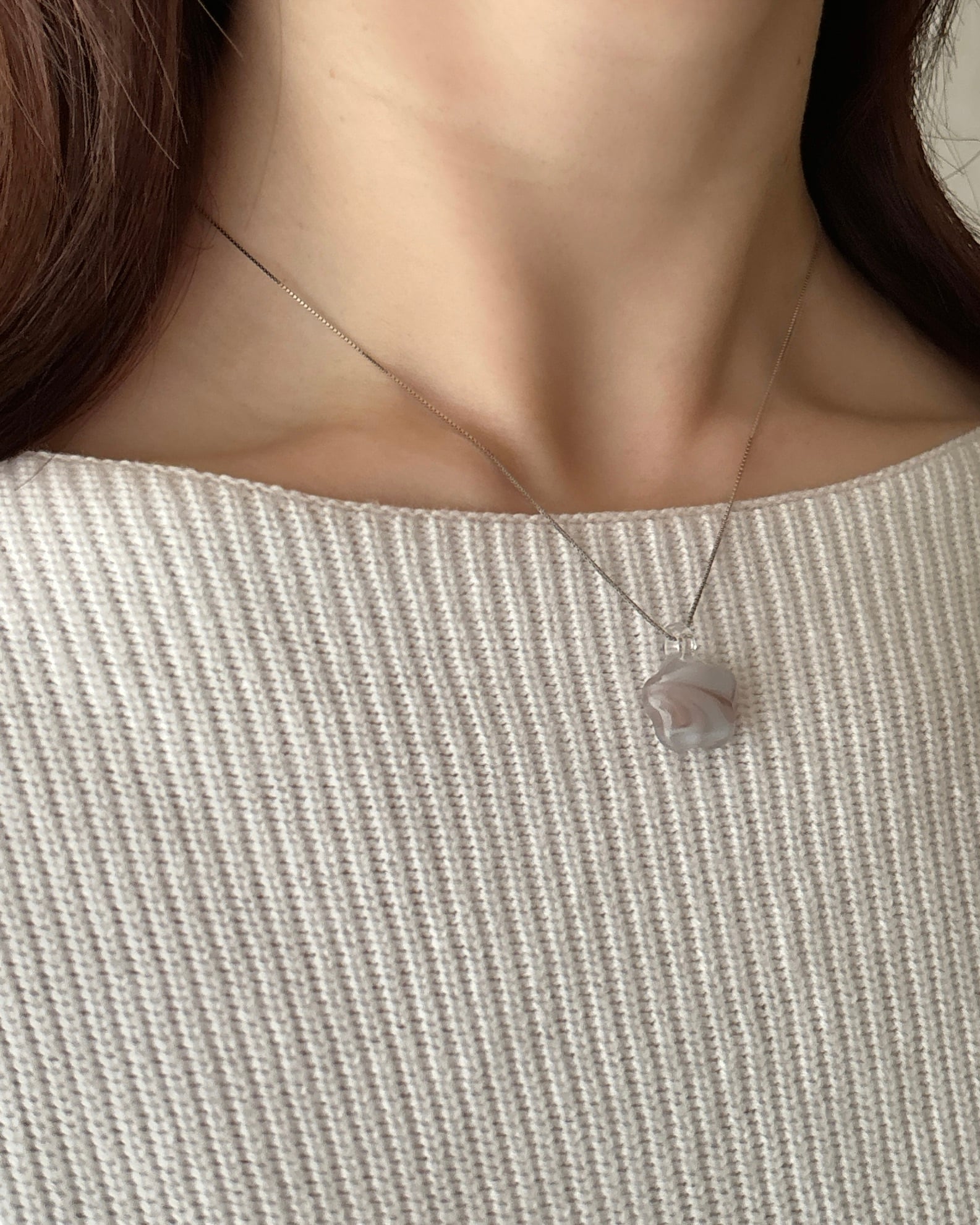 ※ 画像のように、スライドボールをお好きな位置に簡単に留めることができるため、お洋服の襟元に合わせて、短めや長めに変更して着用することができます