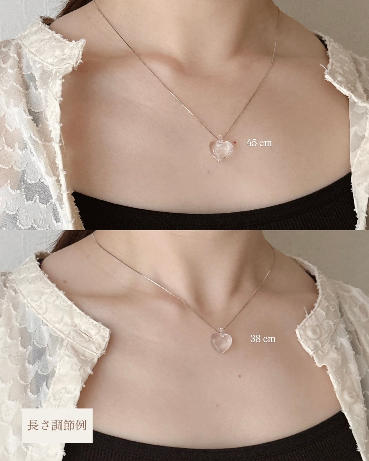 ※ 画像のように、スライドボールをお好きな位置に簡単に留めることができるため、お洋服の襟元に合わせて、短めや長めに変更して着用することができます