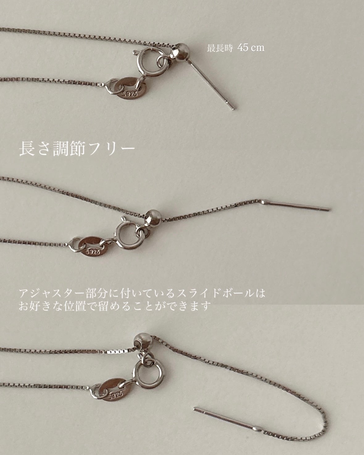長さ調節が簡単なスライドボール付きのシルバ−925チェーンを使用しております